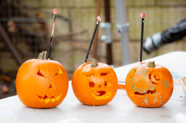 We had a great, if slightly wet, time at this year’s pumpkin carving. We upped our game and had some serrated saw-like tools available to use which allowed more intricate, elaborate designs (note the pumpkin with spiral eyes!).